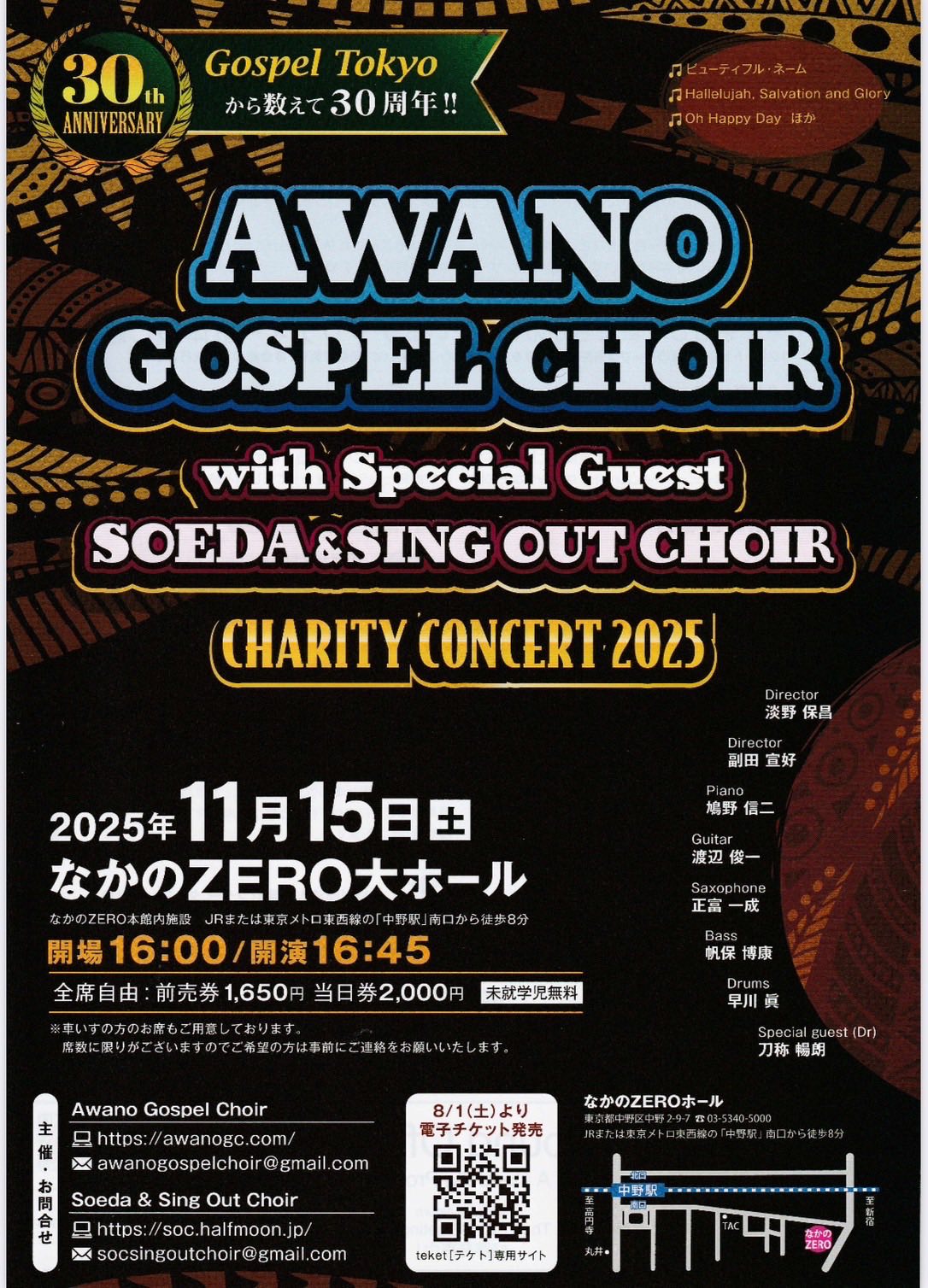 8月になりました’25 未分類 2025.08.15 先日の投稿でもお伝えした、 秋のコンサートのお知らせです。 淡野先生率いるAWANO GOSPEL CHOIRの コンサートに、JCNも参加致します。 ご興味のある方は、ぜひお越しください。